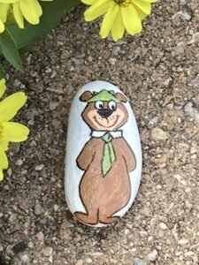 This is where I found a hidden treasure. I looked down and sitting on top of the border stones was a small smooth stone on which someone had painted a picture of Yogi Bear. I was impressed with the detailed artwork. To me it was very precise. I was so captured by this little piece of art that I took a picture of Yogi, both close up and from a distance. After viewing the photos, this is what came to mind.