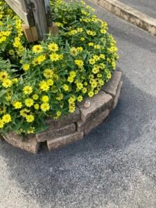 While in Pennsylvania, Cherie and I went to a farmer’s market to pick up some fresh fruits and vegetables. Quite a little place, they had fresh flowers, breads, pies, cookies, fruit, vegetables, etc. Their slogan should be “We’re small, but we have it all!” We navigated our way through the market, saying “Excuse me” and “I’m sorry” a number of times (did I mention this place was small?), finally finished our shopping, and headed to our car. In the parking lot was a small flower bed with landscape blocks bordering planted yellow flowers and the market’s sign.